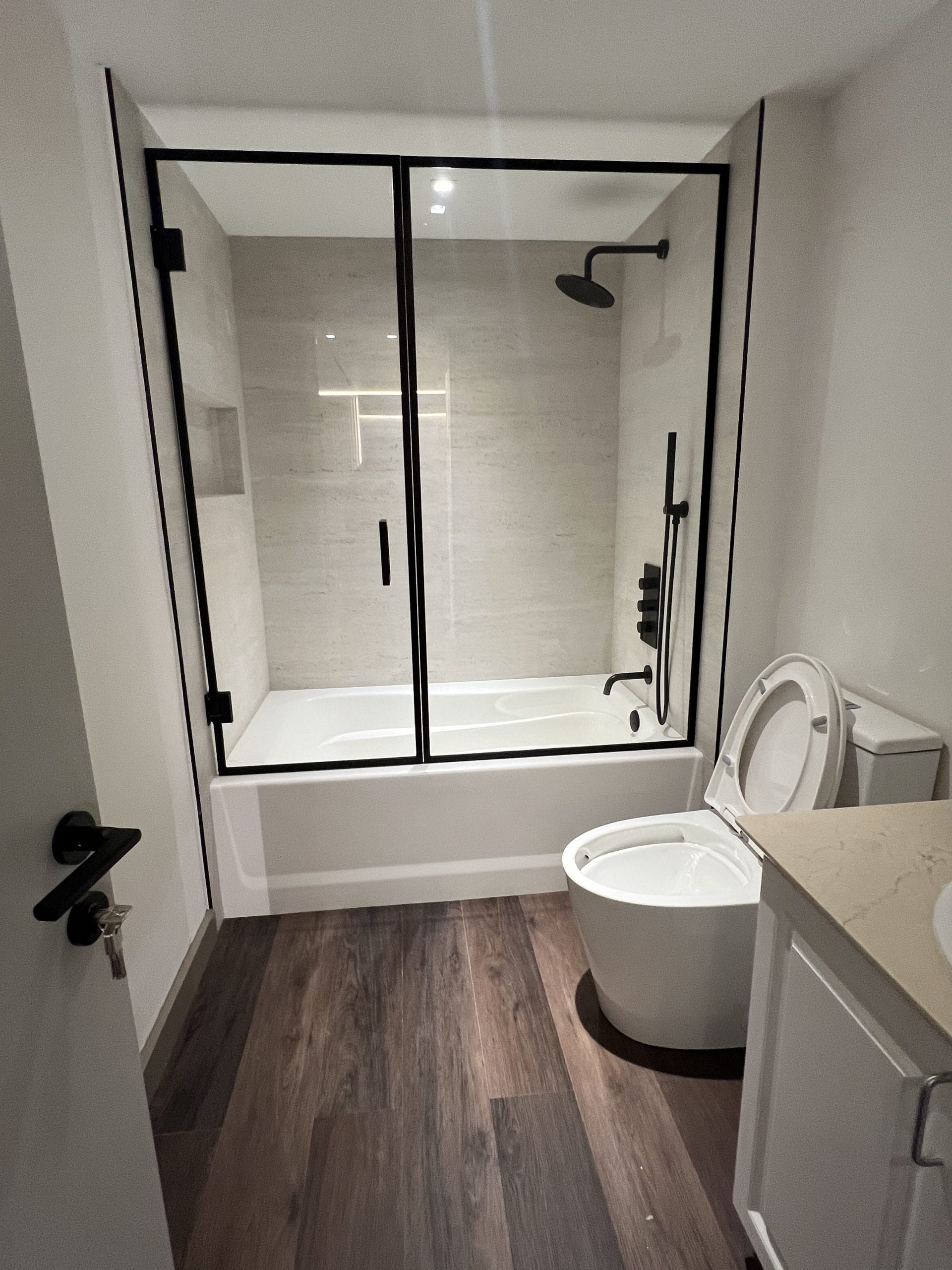 The scope began with the complete demolition of the existing kitchen and key interior surfaces to prepare for the installation of new stone finishes, as well as the removal of the existing bathroom vanity. A new custom vanity and countertop were fabricated and installed, along with a new toilet and a sleek glass enclosure for the bathtub, enhancing both comfort and visual appeal.